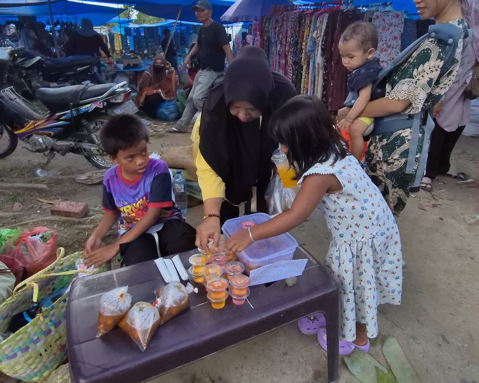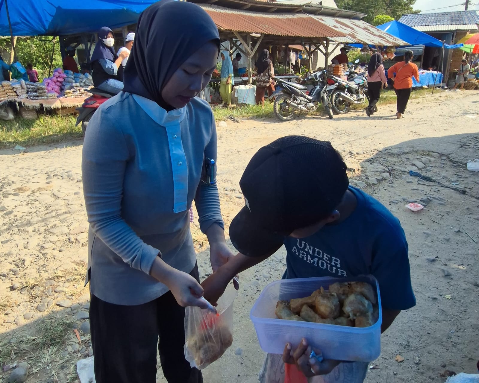 Setiap pulang sekolah, ia keliling jualan gorengan di pasar. Harga gorengan hanya seribu per pcs. Sayangnya tidak laku semua. Tak jarang ia duduk termenung menunggu pembeli sendirian.