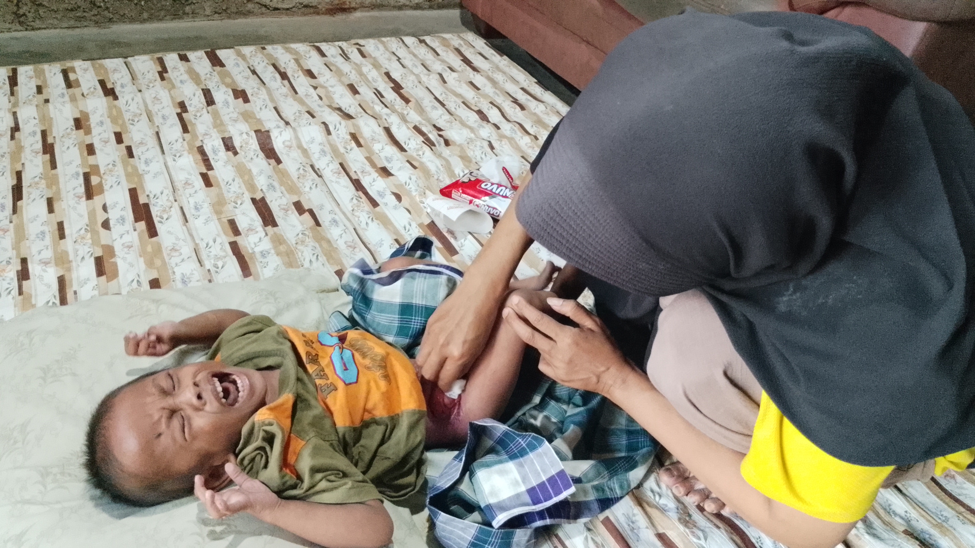 Al Ghazali, putra kecil nya hanya bisa terbaring dan meringis kesakitan, tubuh nya kian hari semakin kurus. Padahal usianya baru 3 tahun.