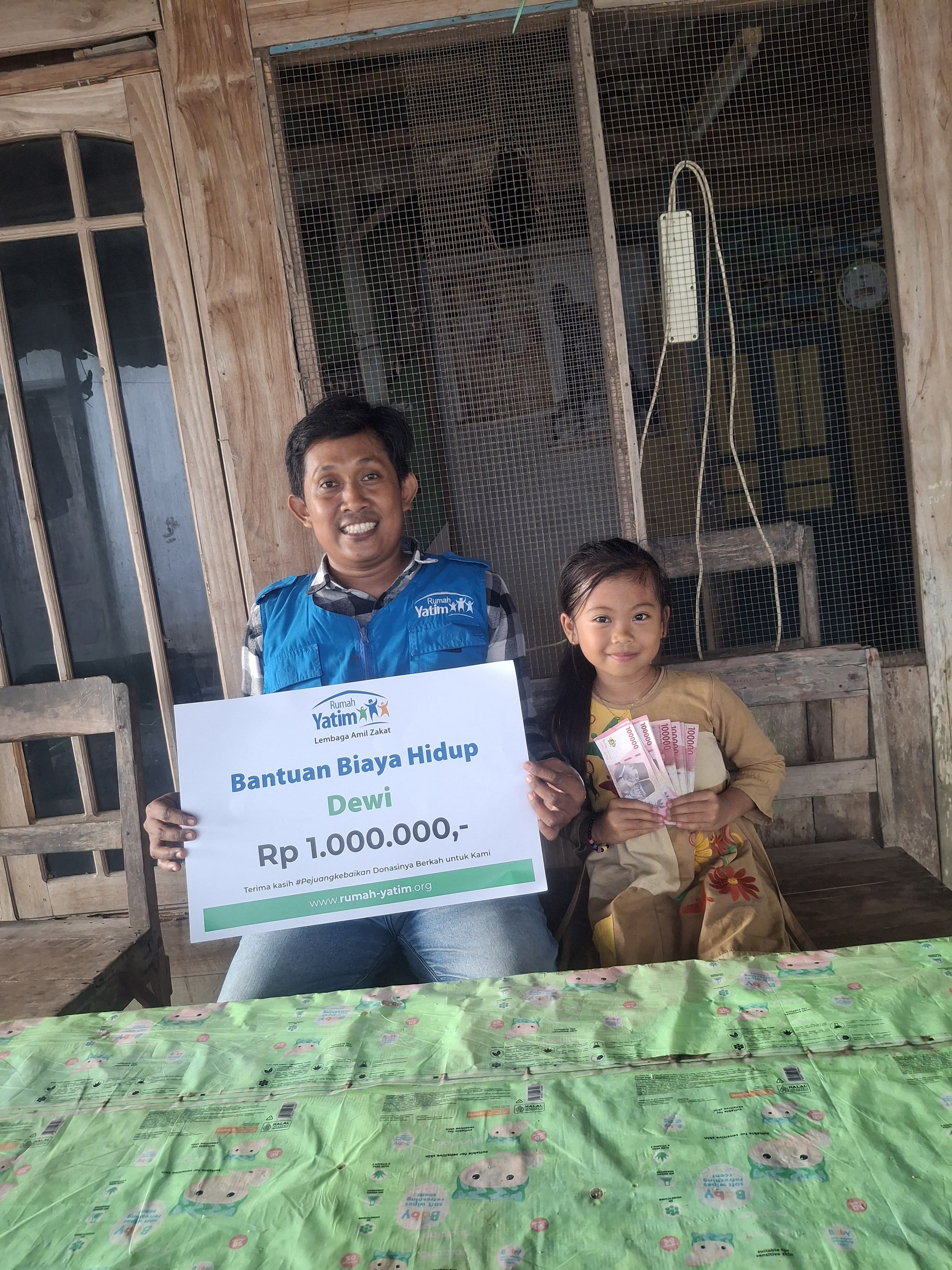 Alhamdulillah dana yang di titipkan melalui https://berkahyatim.com/dewiterlantarry telah kami salurkan kepada Dewi. Alhamdulillah untuk penyaluran Ke 1 ini kami datang dengan memberi bantuan berupa Uang tunai.