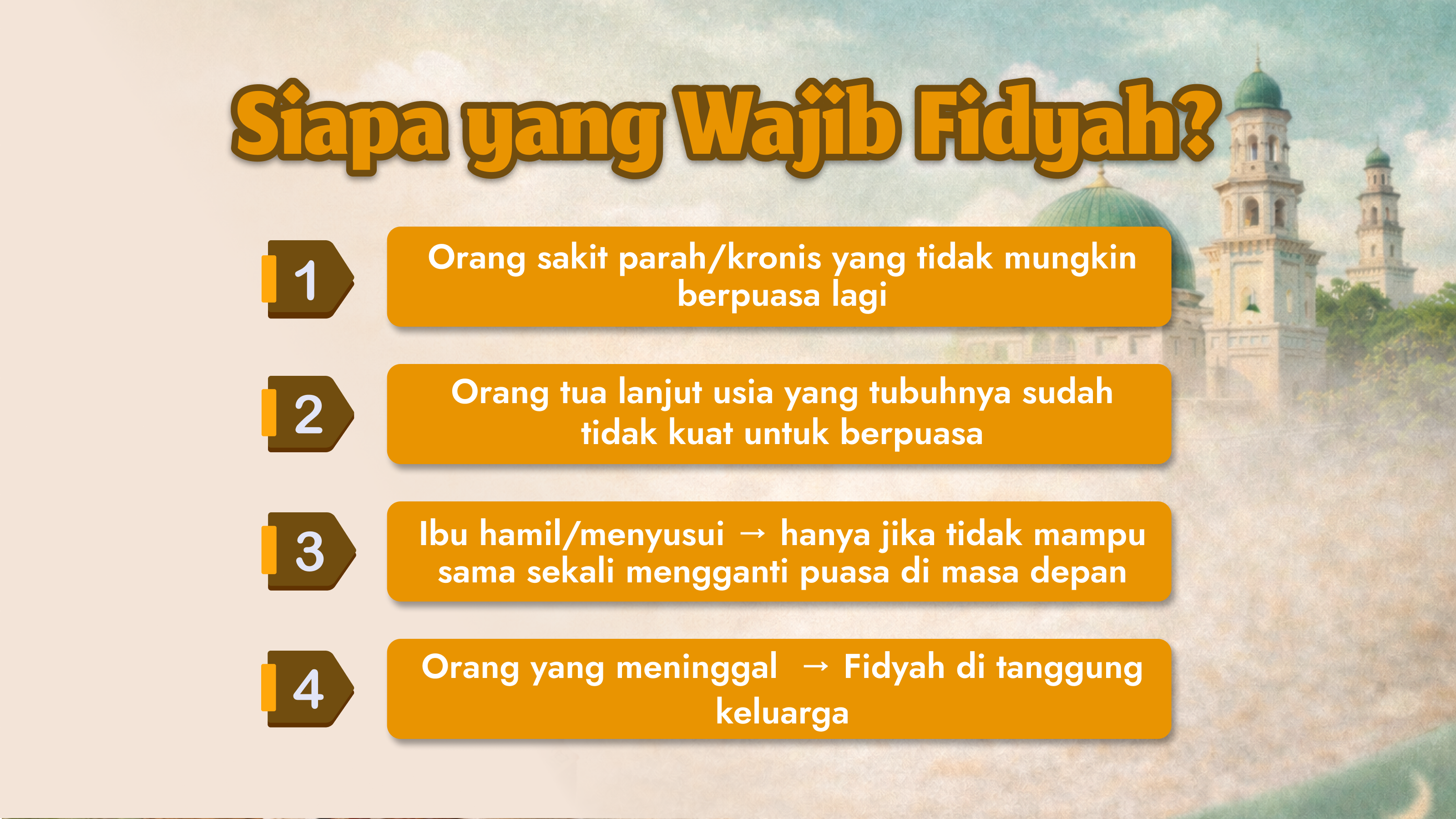 - Fidyah wajib bagi mereka yang benar-benar tidak mampu berpuasa lagi, seperti orang sakit parah atau menahun, lansia yang tubuhnya sudah lemah, ibu hamil atau menyusui yang tidak memungkinkan mengganti puasa di kemudian hari, serta orang yang telah meninggal dunia yang fidyahnya ditunaikan oleh keluarga.