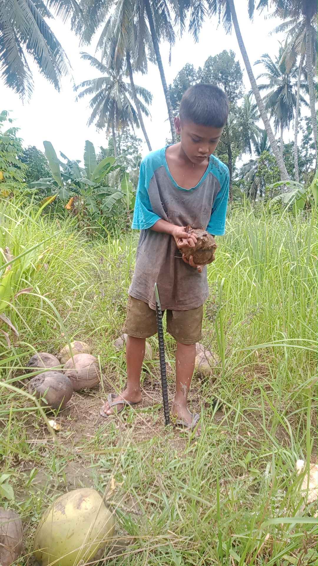 Sepulang sekolah, Fikri bergegas pergi ke tempat nya bekerja. Ia menjadi buruh pengupas kelapa.