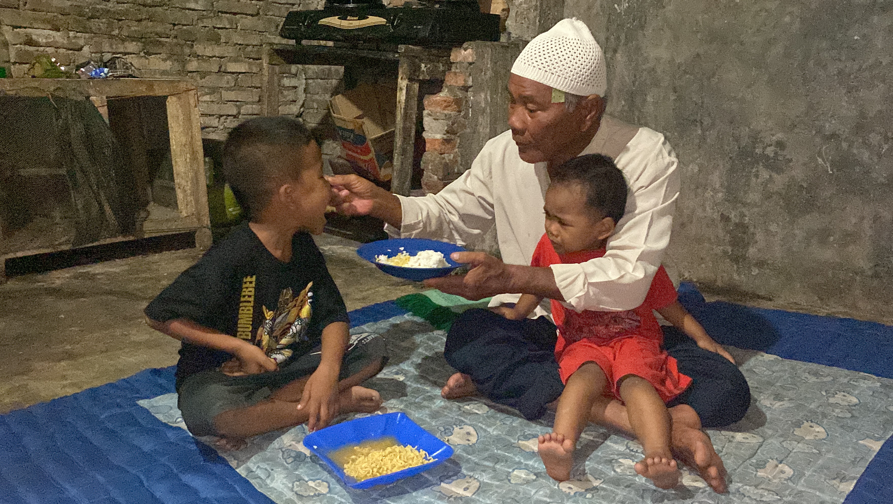 Di usia 61 tahun, Kakek Amin harus berjuang keras untuk bertahan hidup bersama cucu-cucunya yang masih kecil yaitu Dimas (5) dan Dafa (2 tahun).