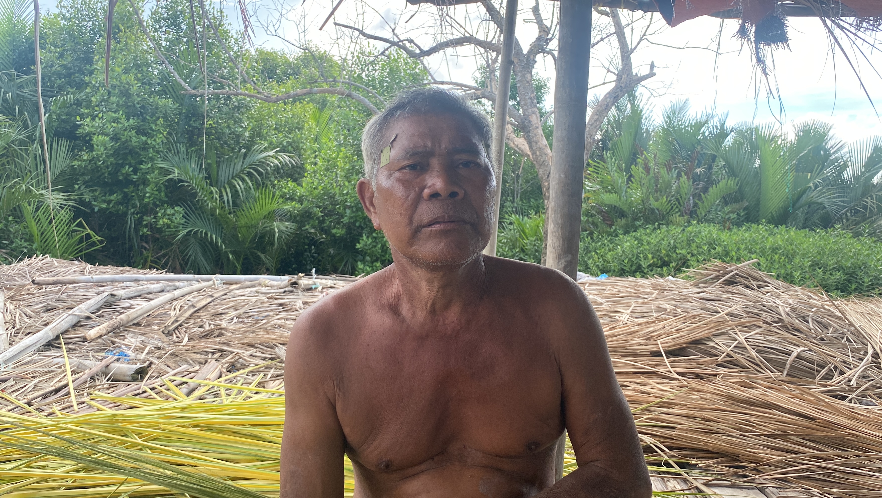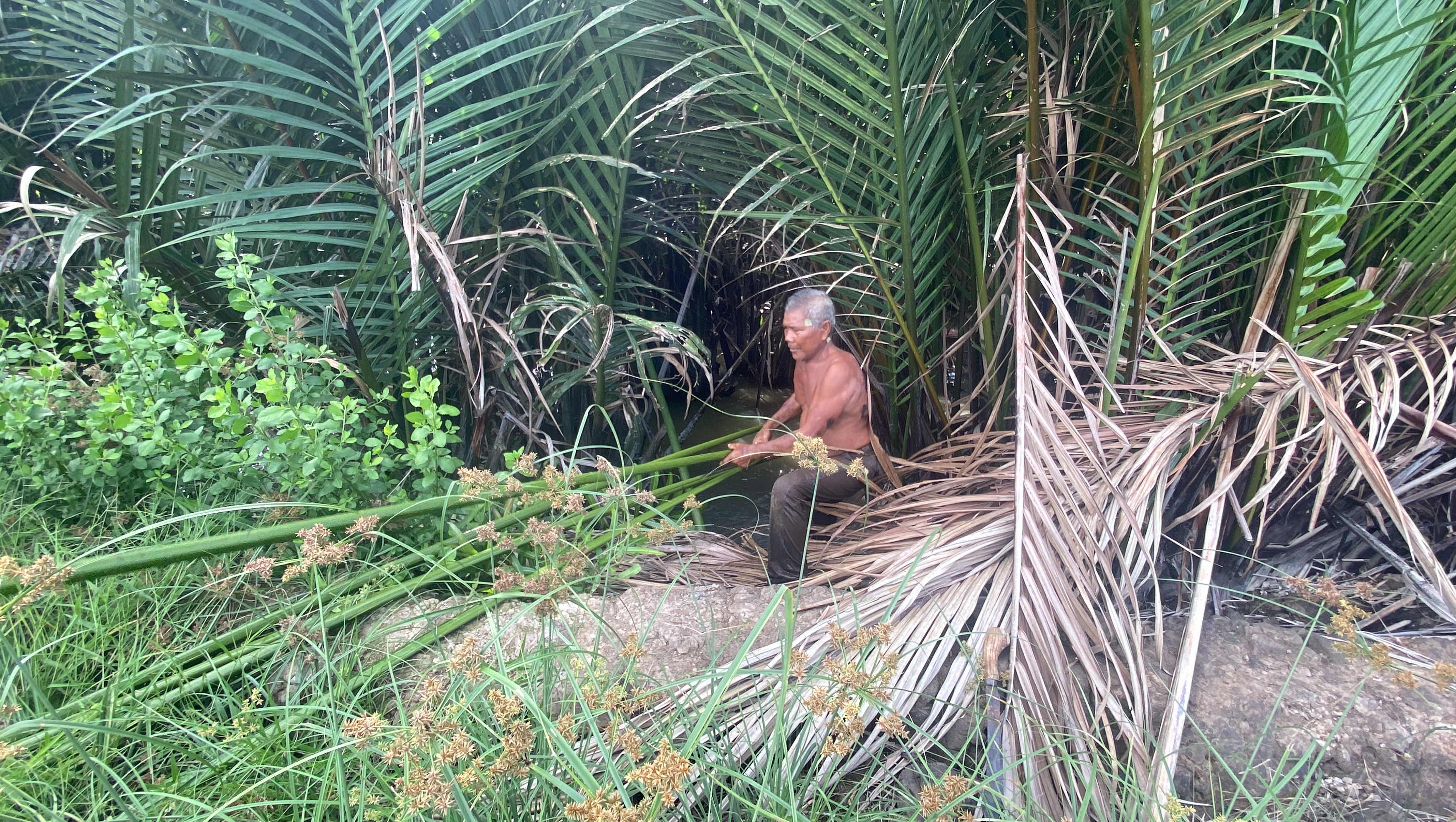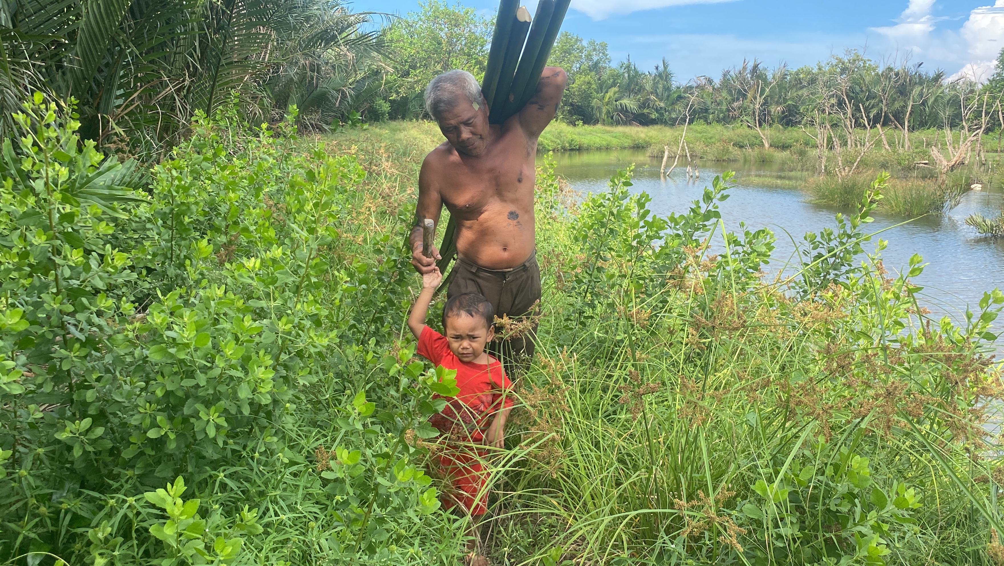Untuk bertahan, kakek harus berjalan kaki sejauh 20 km ke hutan untuk mengambil daun nipah. Untuk itu harus menyebrangi sungai dulu, kemudian di potong-potong menjadi sapu lidi.