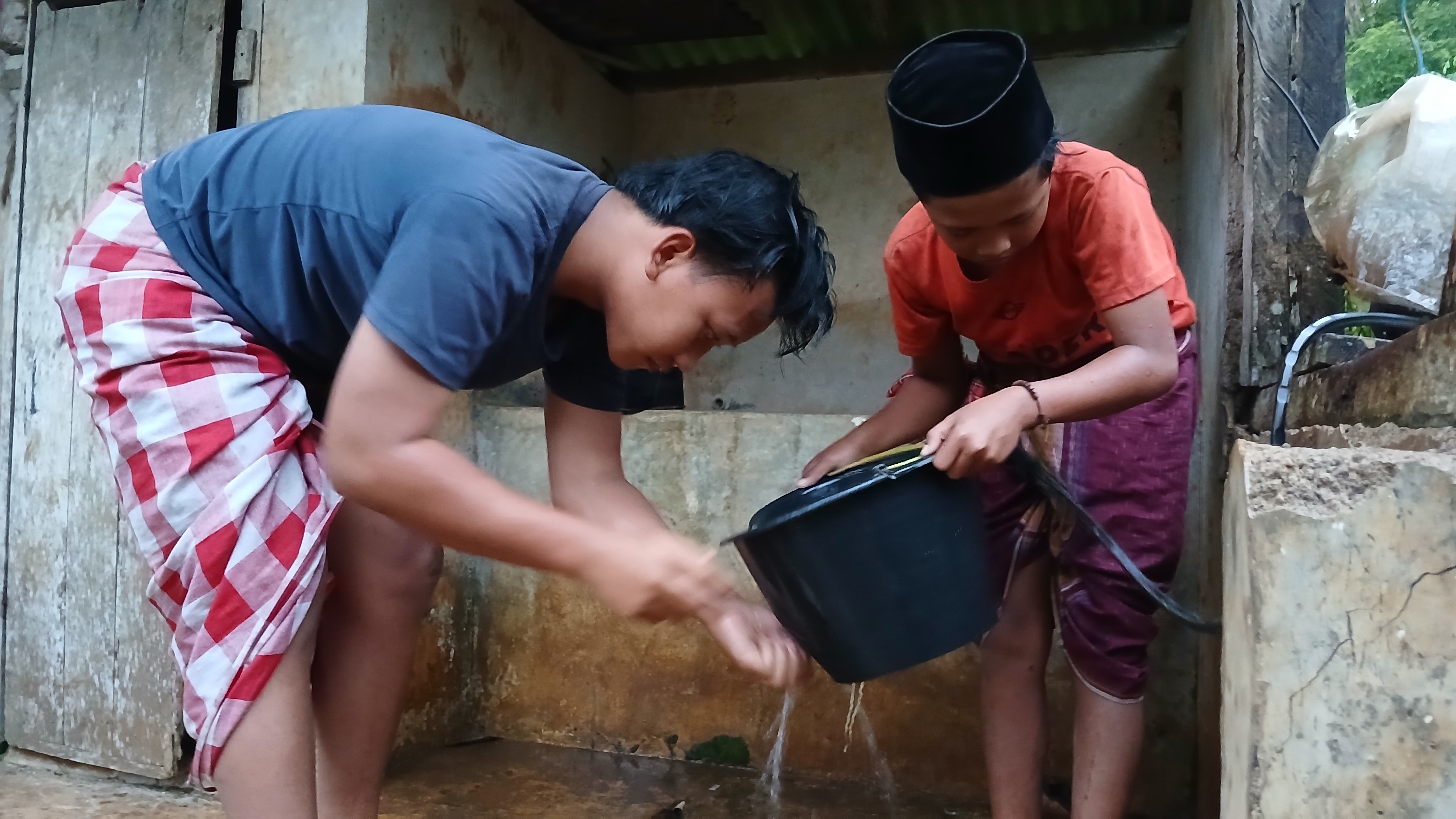 Air nya keruh dan tanpa saluran yang memadai untuk berwudhu, warga harus menimba air dan bergantian.