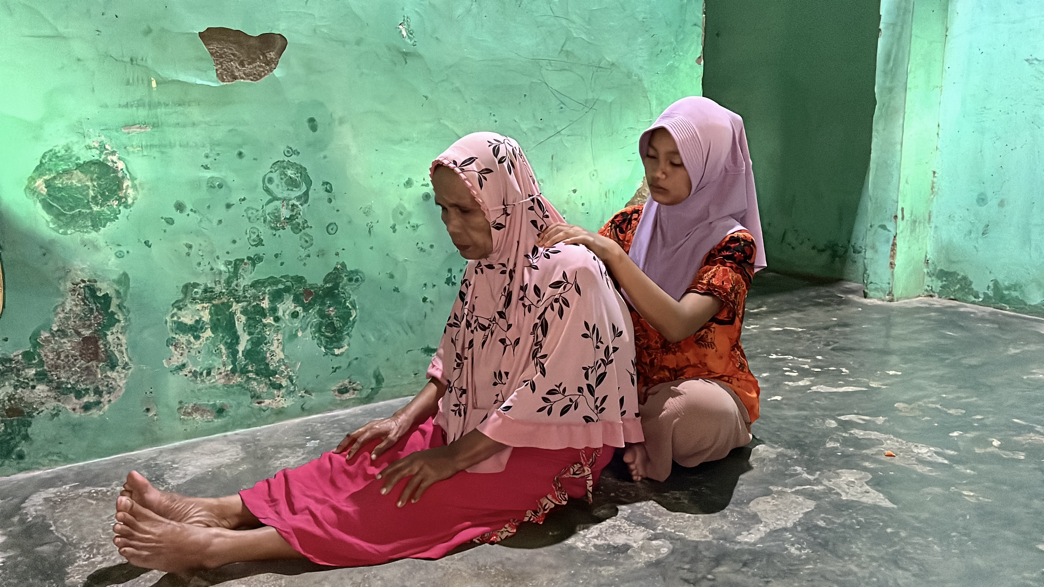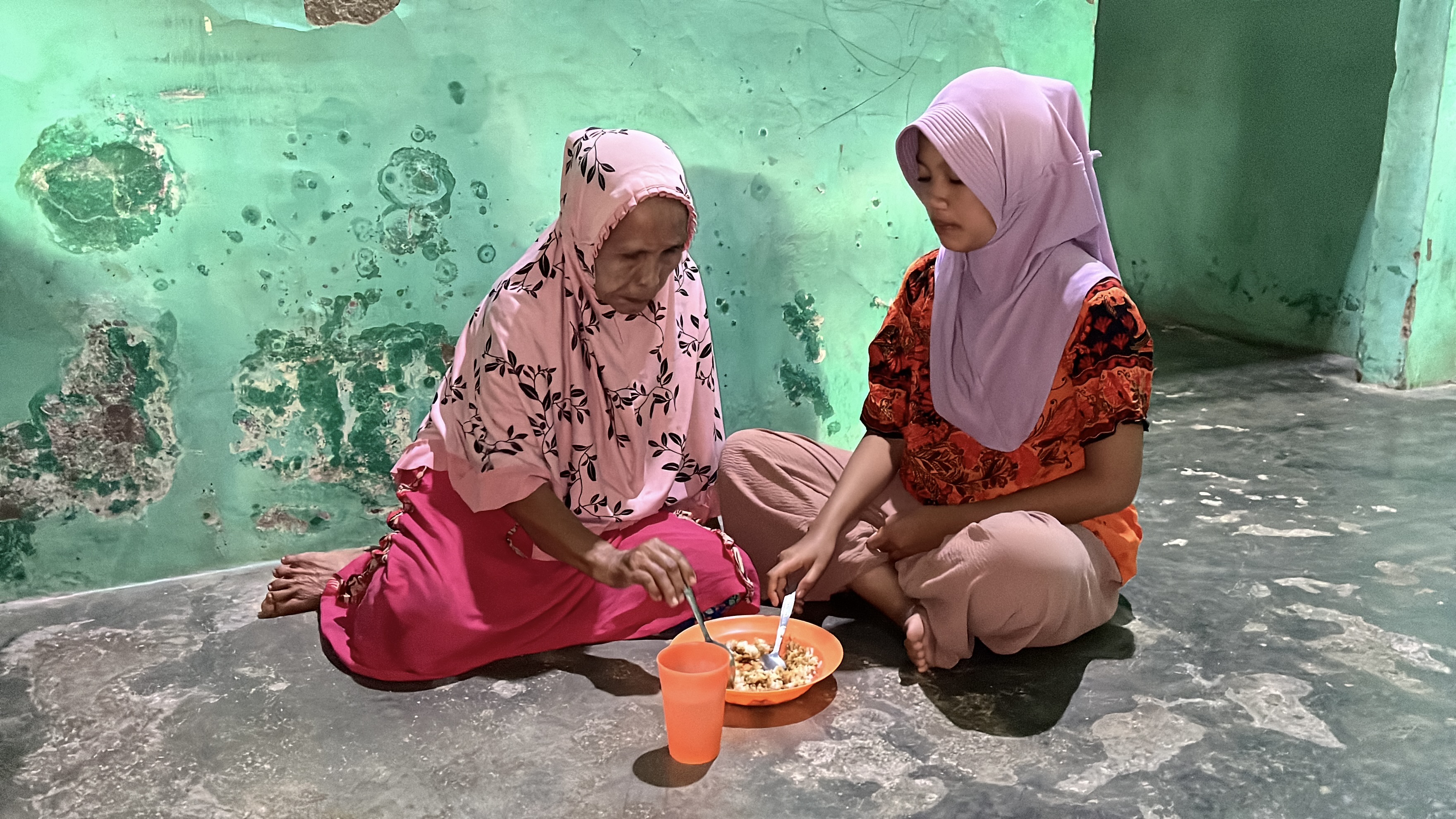 Nenek Sumiati dulu bekerja sebagai buruh tani, namun kini tak lagi mampu bekerja karena usia renta dan penyakit asam urat yang sering kambuh. Tak ada lagi penghasilan tetap untuk mereka berdua.